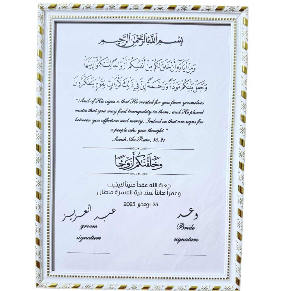 برواز أنيق لوثيقة عقد النكاح، بمقاس A4 مزخرف، يحتوي على مساحة مخصصة للتوقيعات، مثالي لعرض ذكرى الزواج في منزلك.