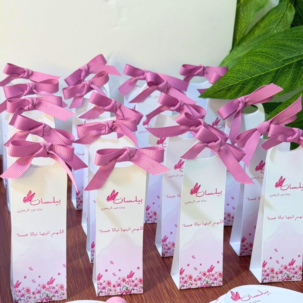 تصميم البوكس يتمتع بلمسات ناعمة ومشرقة تجعله يبدو كقطعة فنية صغيرة، ويُقدم بشكل فخم بفضل الفيونكة الوردية المتقنة المثبَّتة في أعلى العلبة. هذه الربطة المصنوعة من شريط أنيق تضفي روحًا احتفالية واضحة، وتمنح العلبة مظهرًا جاهزًا للتقديم فورًا دون الحاجة لأي إضافات أو تجهيزات إضافية، مما يوفر الوقت والجهد على صاحبة المناسبة.
