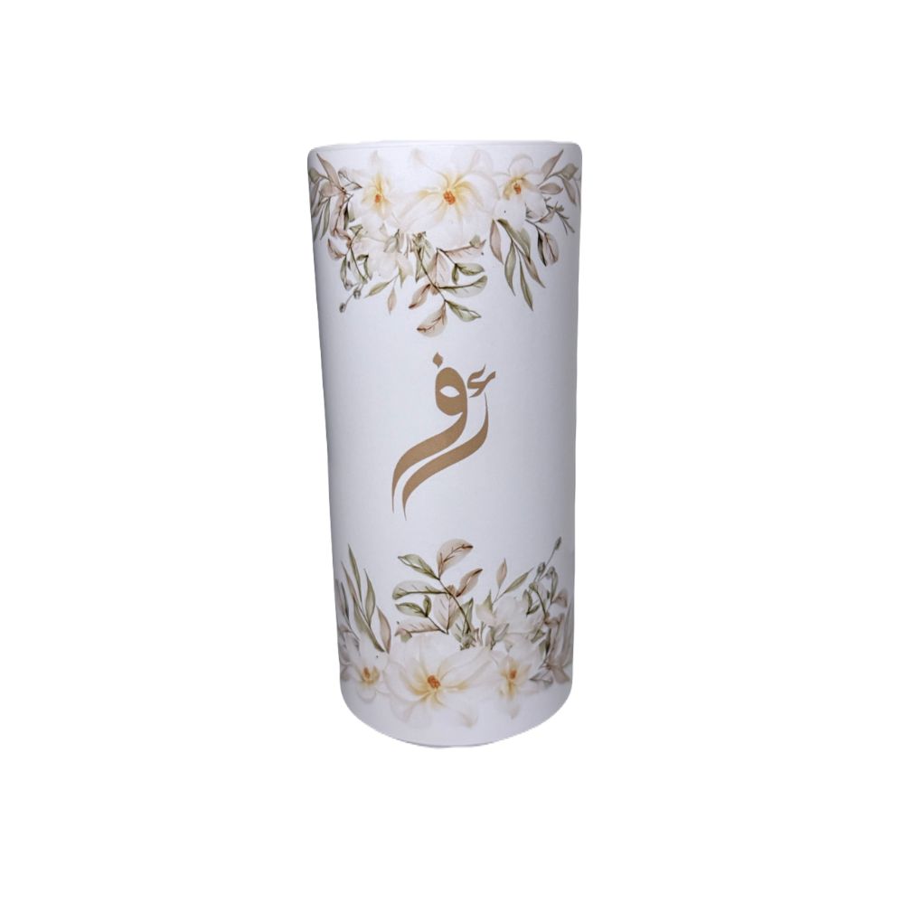 تصميم فاخر أنيق: مزيج من الزهور الناعمة والخط العربي الفاخر يمنح العلبة مظهرًا جذابًا.