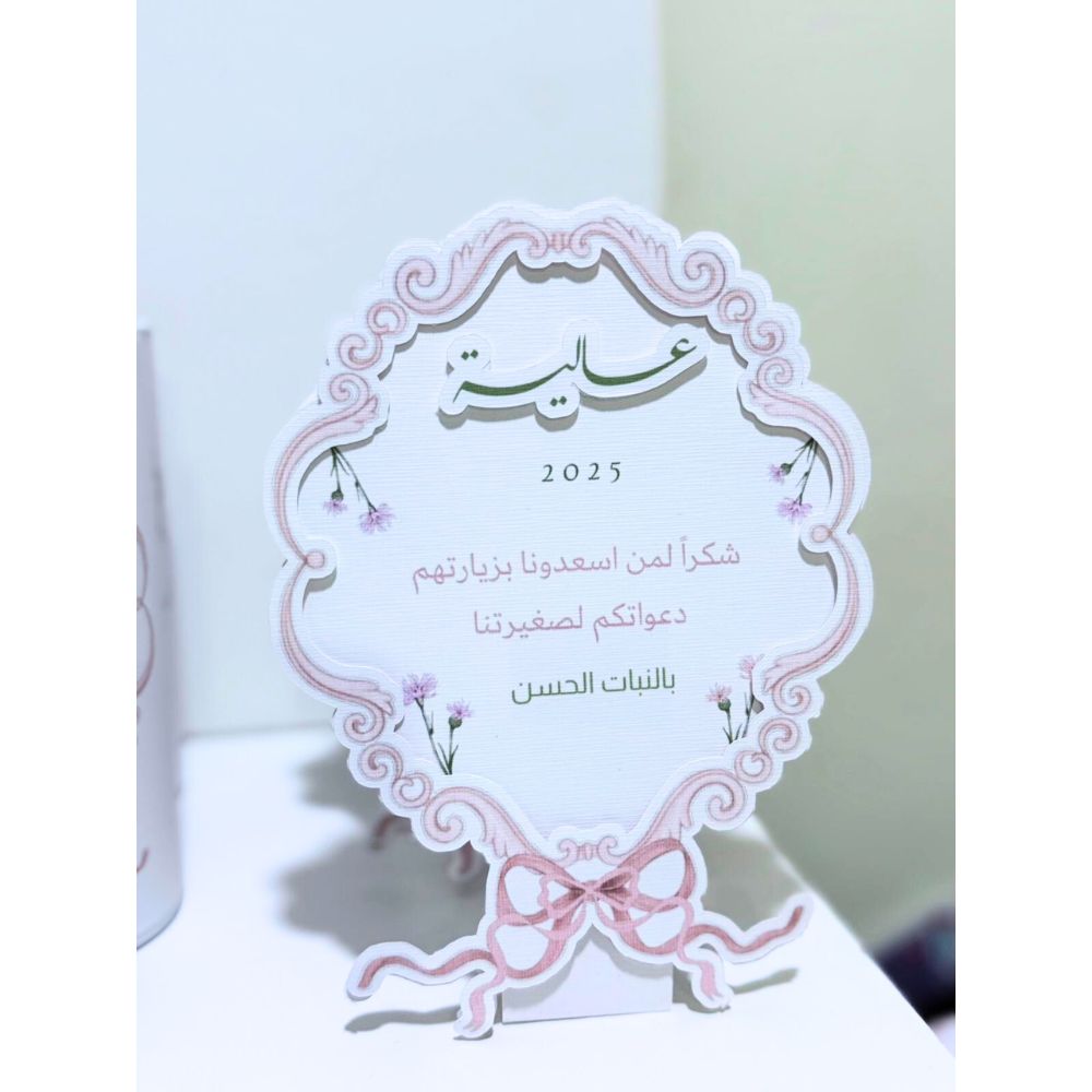 القاعدة السفلية للكرت مصممة على شكل فيونكة بارزة أيضًا، وهي جزء مهم من الهوية الشكلية للكرت. هذه الفيونكة تضيف لمسة لطيفة واحتفالية، وتعزز من ثبات البطاقة على الطاولة، بحيث تقف بشكل جميل دون الحاجة لأي دعامة إضافية. ويبرز الكرت بفضل الطباعة المتقنة التي تجعل الخطوط واضحة والتفاصيل الدقيقة بارزة بشكل جذاب.